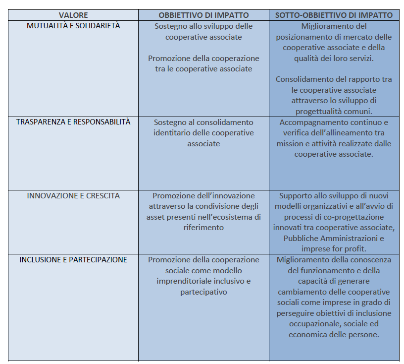 Il Consorzio Quarantacinque nel suo agire è guidato da alcuni valori, espressione della sua identità, che orientano le scelte strategiche e, di conseguenza, la sua operatività.Attraverso questi valori, le attività e i progetti che di anno in anno vengono sviluppate e sostenute dal Consorzio Quarantacinque perseguono obiettivi di cambiamento di lungo periodo (impatto) nei confronti delle proprie consorziate e delle comunità di riferimento.